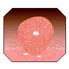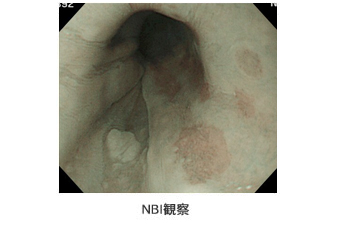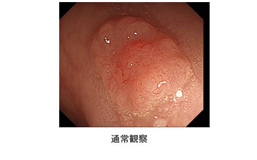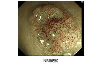 NBI装置(Narrow Band Imaging;狭帯域光観察)付きの内視鏡で検査すると、胃・大腸の表面の血管部分が茶色に見えることによって模様がはっきりします。血管模様によって、通常はまず見えないような小さい病変や、ポリープのタイプが概ねわかるので大変便利で、癌の早期発見に役立ちます。 |